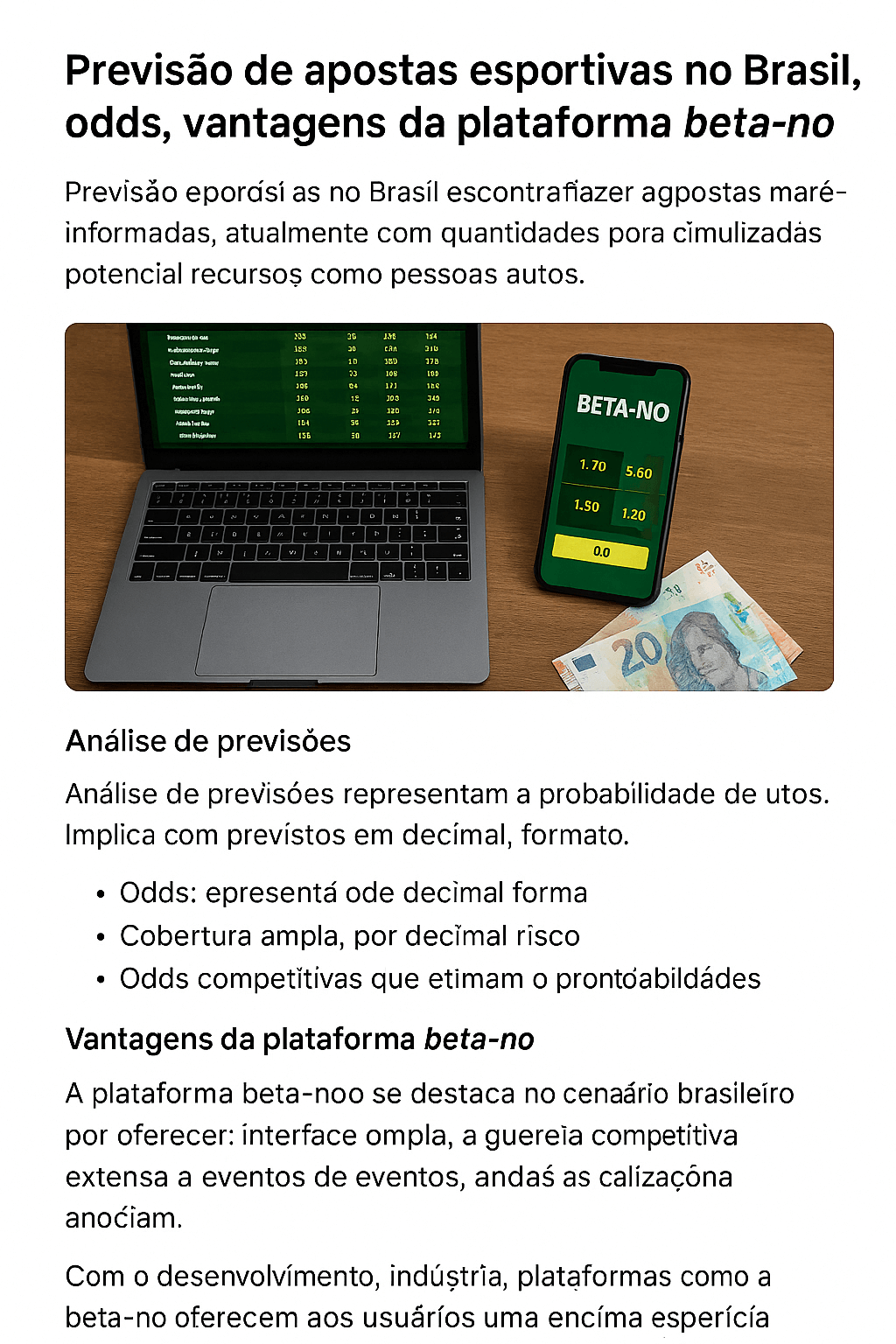 A imagem abaixo mostra a interface da plataforma beta-no com tela de odds, dispositivos móveis e notas de euro, simbolizando o aspecto financeiro das apostas: